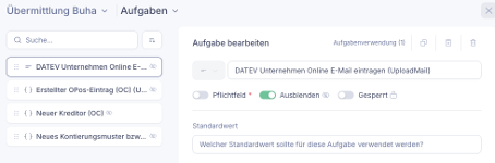 - Prüfen Sie, ob die Aufgabe „DATEV Unternehmen Online E-Mail eintragen (UploadMail)“ ausgeblendet ist. Falls ja, fahren Sie mit der Anleitung fort.