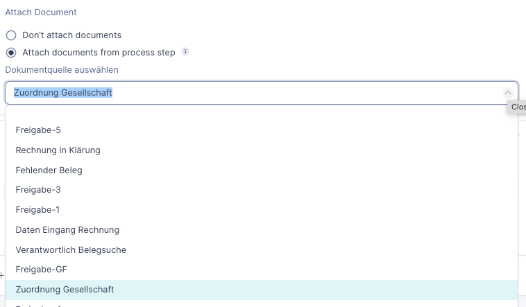 Falls Sie ein Dokument anhängen, müssen Sie noch auswählen, in welchem Prozessschritt das Dokument gespeichert ist: