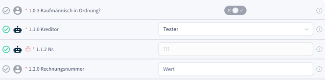 Eine Aufgabe ist ein Feld innerhalb eines Prozessschritts und kann sowohl automatisch als auch manuell mit Informationen befüllt werden. Pflichtaufgaben sind durch ein Stern-Symbol gekennzeichnet, gesperrte Aufgaben durch ein Schloss und Aufgaben mit automatischer Befüllung werden durch ein Roboter-Symbol dargestellt.