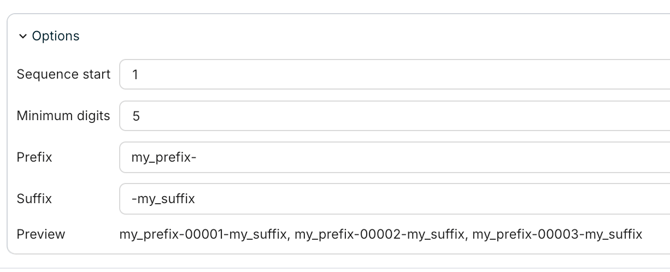 Beim Konfigurieren sehen Sie eine Live-Vorschau, die Ihnen direkt zeigt, wie Ihre Einstellungen (Präfix, Suffix, Mindeststellenanzahl, Startwert) im Ergebnis aussehen werden.